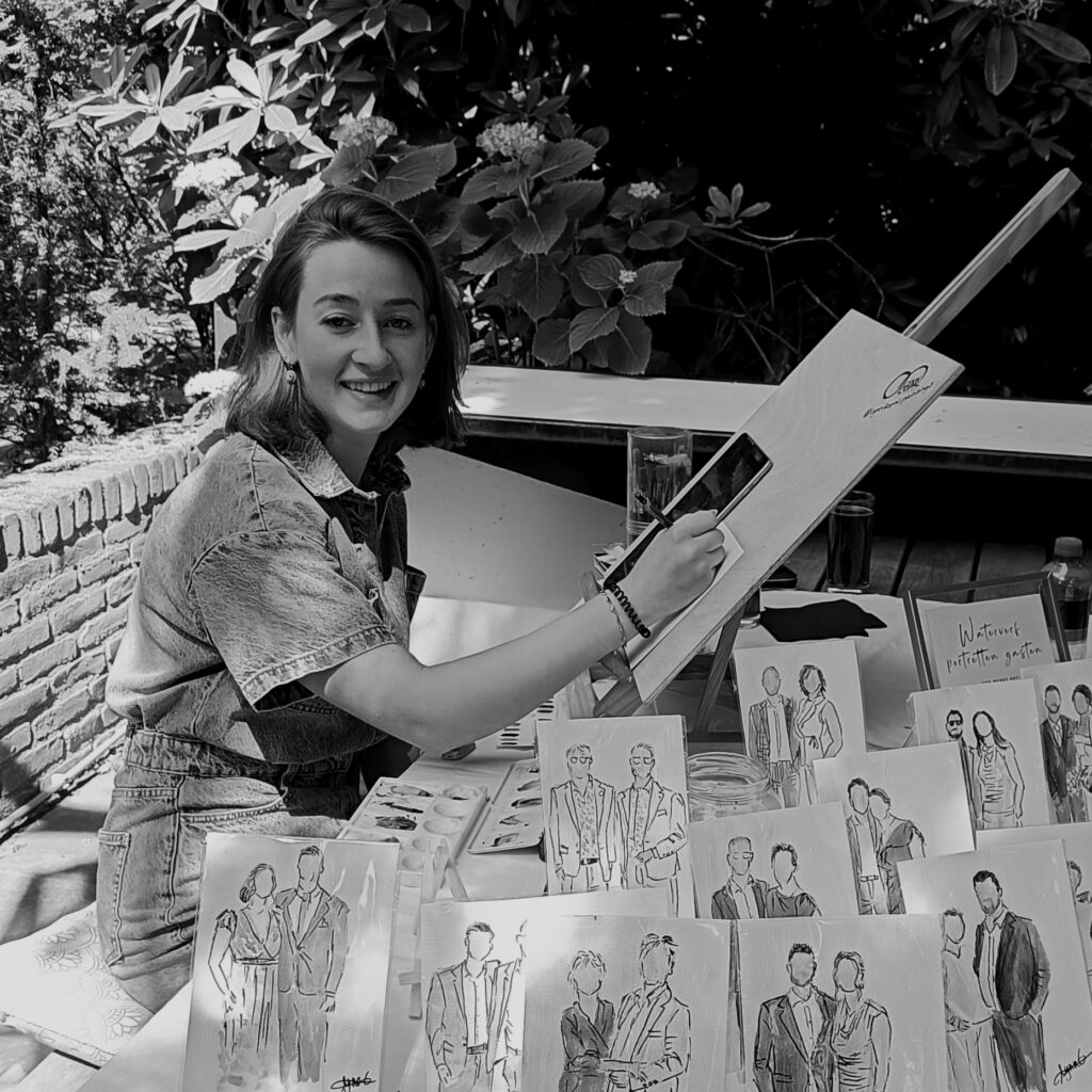 Zo kwam ik uit bij het maken van live waterverfportretjes. Nou ja… eigenlijk kwam dat niet helemaal vanuit mijzelf. Een bruidspaar — waarvan de bruid een vriendin van mij is — vroeg of ik dit voor hen kon doen. Ik had het nog nooit gedaan, maar dacht: ik heb het nog nooit gedaan, dus ik denk dat ik het wel kan.